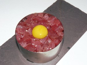 La classica Tartare è un piatto a base di carne bovina o equina macinata o finemente tritata e consumata cruda, abbinata con cipolla, capperi, un tuorlo d'uovo.