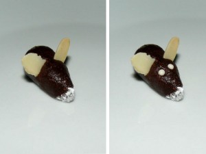 Applicare le scaglie di mandorle come orecchie, sporcare con lo zucchero a velo la punta del naso e infine posizionare i confetti come occhi.